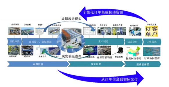 MBSE的建模思想強(qiáng)調(diào)“以終為始、達(dá)成愿景”,從而能夠?qū)?/span>“概念設(shè)計(jì)中”的柔性化制造供應(yīng)鏈系統(tǒng)具像化、數(shù)字化、場(chǎng)景化,并通過(guò)數(shù)字孿生(DT digital twin)模式來(lái)仿真與驗(yàn)證,真實(shí)的達(dá)成“個(gè)性化訂單集成拉動(dòng)資源”與“從訂單信息到實(shí)際交付”之間的協(xié)同。如圖所示。