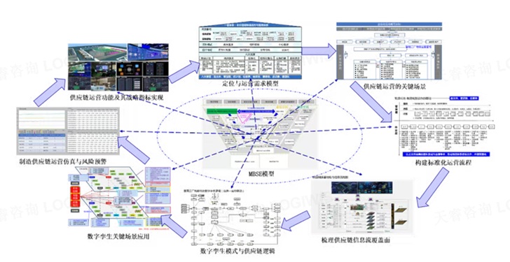 根據(jù)MBSE模型,結(jié)合泰國(guó)工廠制造供應(yīng)鏈的愿景目標(biāo)和規(guī)劃導(dǎo)向,在“以終為始、達(dá)成愿景”的原則下,定義與定位運(yùn)營(yíng)需求模型。泰國(guó)工廠的供應(yīng)鏈運(yùn)營(yíng)要求需要達(dá)到全價(jià)值鏈運(yùn)作與智能化協(xié)同管理。所以在運(yùn)營(yíng)過(guò)程中梳理了“一套體系、兩條脈絡(luò)、三種模式、四個(gè)特征、六大支撐和八大運(yùn)營(yíng)管理要素”,基本上精準(zhǔn)定位了SMSC運(yùn)營(yíng)的格局。在此基礎(chǔ)上梳理運(yùn)營(yíng)的關(guān)鍵場(chǎng)景,以點(diǎn)帶面的梳理支撐智能制造的供應(yīng)鏈需求和標(biāo)準(zhǔn)化運(yùn)營(yíng)流程,然后將流程參數(shù)化,成為信息流程的底層邏輯數(shù)據(jù),導(dǎo)入DT模式與邏輯,形成整個(gè)智能制造供應(yīng)鏈系統(tǒng)的集成平臺(tái),能夠?qū)崿F(xiàn)綜合仿真和針對(duì)每個(gè)訂單的可行性研究和仿真,實(shí)現(xiàn)早期的風(fēng)險(xiǎn)識(shí)別、預(yù)警和防范,最終達(dá)成運(yùn)營(yíng)功能和相關(guān)的運(yùn)營(yíng)指標(biāo),賦能智能工廠經(jīng)營(yíng)。