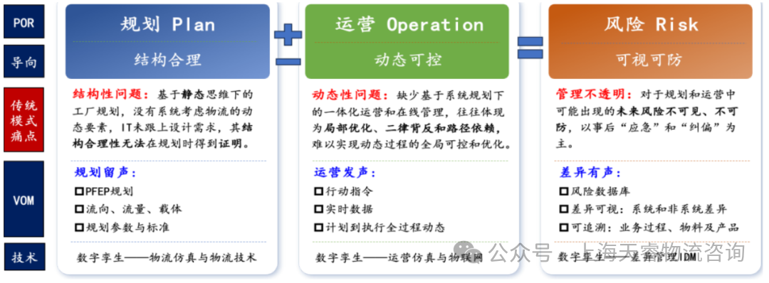 在實(shí)施過程中,需要確保P(規(guī)劃)過程結(jié)構(gòu)合理、O(運(yùn)營(yíng))過程動(dòng)態(tài)可控、R(風(fēng)險(xiǎn))過程可視可防。針對(duì)傳統(tǒng)模式中存在的結(jié)構(gòu)性問題、動(dòng)態(tài)性問題和管理透明度問題,VOM模型強(qiáng)調(diào)在規(guī)劃的過程能夠給物料“留聲音”;在運(yùn)營(yíng)的過程,希望物料“能夠發(fā)聲”;在風(fēng)險(xiǎn)的過程,希望物料針對(duì)差異能夠發(fā)出自己“‘抱怨的’聲音”。技術(shù)支撐方面,可通過數(shù)字孿生實(shí)現(xiàn):在規(guī)劃階段應(yīng)用物流仿真和物流技術(shù),在運(yùn)營(yíng)階段應(yīng)用運(yùn)營(yíng)仿真和物聯(lián)網(wǎng)技術(shù),在風(fēng)險(xiǎn)控制階段則通過差異管理、數(shù)據(jù)驅(qū)動(dòng)以及人工智能AI來實(shí)現(xiàn)自我監(jiān)控和自我調(diào)整。