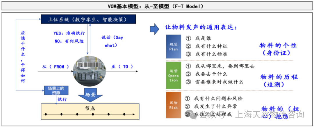 基于物料的流動(dòng)性原則,在VOM的定義和基本模型中,每個(gè)物料在任何場(chǎng)景節(jié)點(diǎn)上都需要有“從-至”模型(From-To,簡(jiǎn)稱FT模型),并基于POR模型進(jìn)行準(zhǔn)確表達(dá)。這個(gè)基本表達(dá)模型中,上位系統(tǒng)負(fù)責(zé)數(shù)字孿生智能決策,場(chǎng)景資源觸發(fā)拉動(dòng)系統(tǒng)。