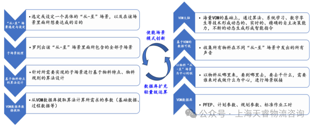 在VOM體系,要能夠做到切實(shí)執(zhí)行物流的執(zhí)行工位的叫料、物流的調(diào)度作業(yè)過程的差異管理。VOM的數(shù)據(jù)庫(kù)和PFEP規(guī)劃參數(shù)標(biāo)準(zhǔn)、參數(shù)指標(biāo)庫(kù),兩者之間互為前提、互為引用和修正關(guān)系,同時(shí)能夠引用,能夠反饋,也能夠集成物料的聲音。從技術(shù)支撐而言,它可以通過數(shù)字孿生、人工智能數(shù)字主線、機(jī)器人技術(shù)、算法、物聯(lián)網(wǎng)技術(shù)、大數(shù)據(jù)、物流技術(shù)、信息技術(shù)、自動(dòng)識(shí)別技術(shù)、傳感技術(shù)等做有效支撐。所以,VOM 的系統(tǒng)邏輯核心是基于VOM的智能監(jiān)測(cè)系統(tǒng),通過模型算法、系統(tǒng)學(xué)習(xí)和數(shù)字孿生不斷的迭代,提升智能化水平,逐步實(shí)現(xiàn)物料的自主指揮系統(tǒng)。