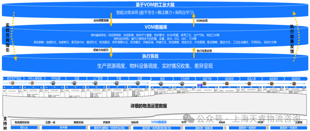 在智能工廠物流作業(yè)領(lǐng)域,VOM體系通過“VOM數(shù)據(jù)庫(kù)”與“VOM大腦”兩個(gè)核心模塊的有機(jī)結(jié)合,形成一套兼具靜態(tài)規(guī)劃與動(dòng)態(tài)決策的綜合管理框架:一方面,VOM數(shù)據(jù)庫(kù)(包含PFEP、規(guī)劃參數(shù)、標(biāo)準(zhǔn)參數(shù)和指標(biāo)庫(kù)等)承擔(dān)了對(duì)物料客觀特征和各類參數(shù)的整理、歸檔和維護(hù)工作;另一方面,VOM大腦(智能決策系統(tǒng))則依托海量數(shù)據(jù)、算法模型、系統(tǒng)學(xué)習(xí)以及數(shù)字孿生技術(shù),對(duì)物流過程中所有物料流轉(zhuǎn)及所發(fā)出的“聲音”進(jìn)行實(shí)時(shí)捕捉與反饋,并在此基礎(chǔ)上生成更加敏捷、精準(zhǔn)且具有自決策能力的動(dòng)態(tài)管理指令。如圖10所示。